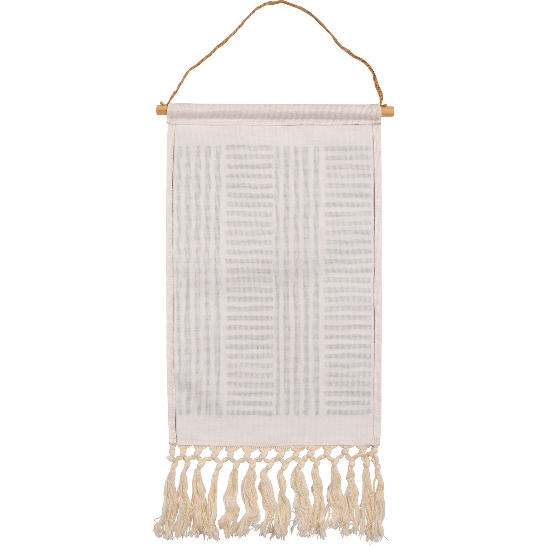 Burlap hanging décor pieces with bohemian style black and white pattern designs with fringe trim accent for added interest. Our Black & White wall décor easily hangs via attached jute rope hangers. Sold Individually, Each Printed as one of a kind pattern.