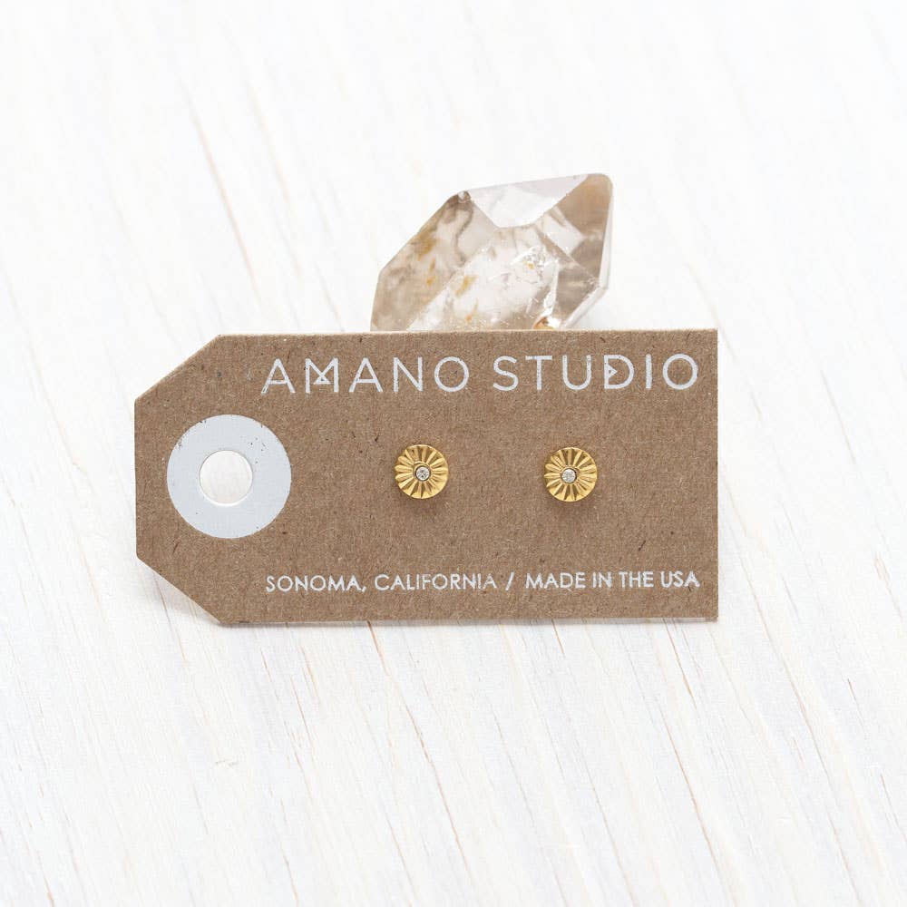 These sweet studs will light up your face with a wink of shine and light. Made of brass with a heavy (7-10 mil) 24k gold plate. Czech crystal. Designed and assembled in our Sonoma California studio.