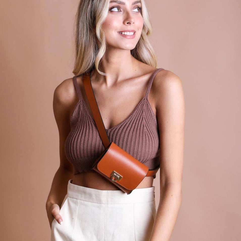 Cognac Mini Faux Leather Belt Bag with Gold Chain