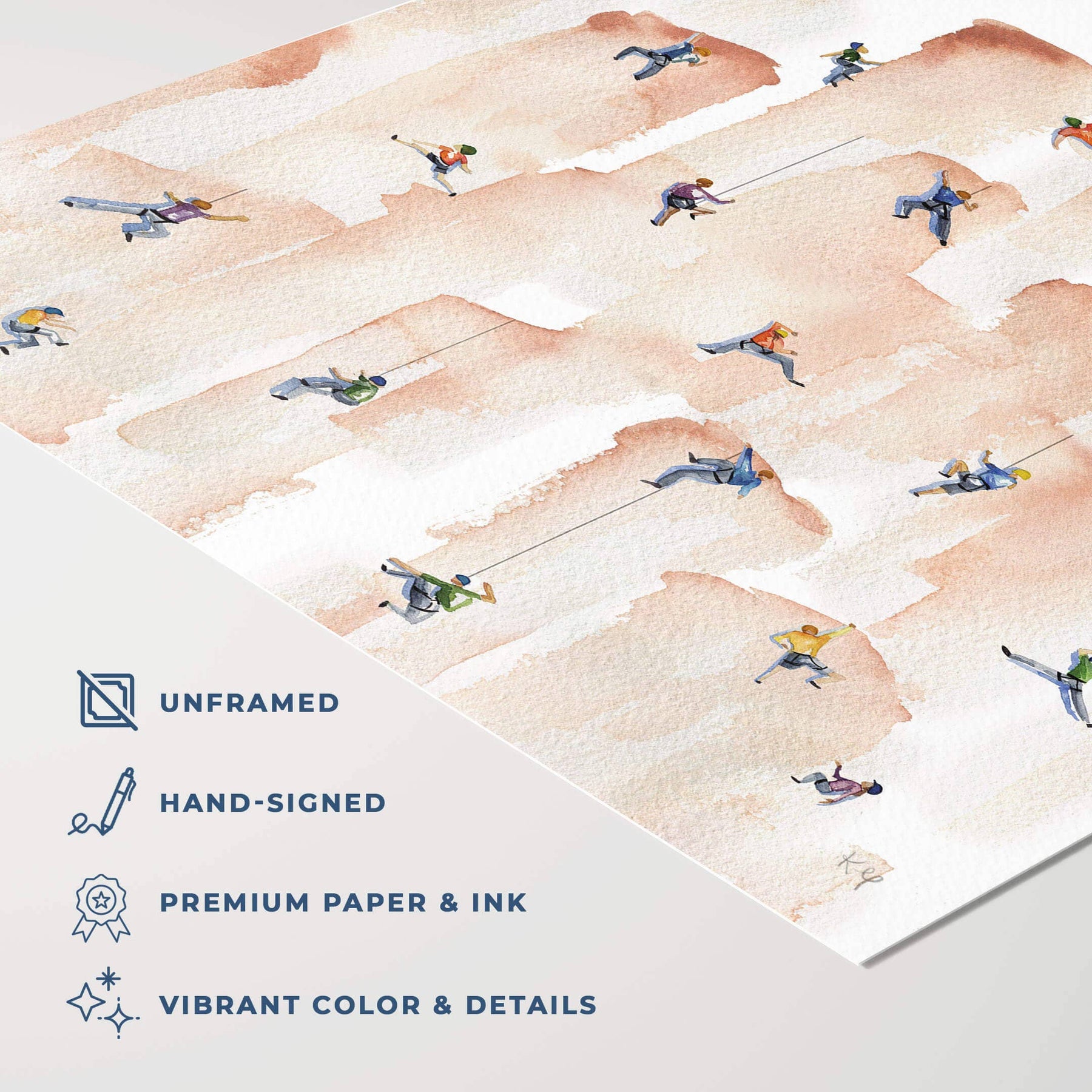 This watercolor art print features a lively scene of climbers scaling sun-washed sandstone cliffs, capturing the energy and movement of the climbing world. Art Print Details: Unframed Art Print on premium paper, archival quality. Packaged flat with clear sleeve and backing board. Size: 8" x 10"