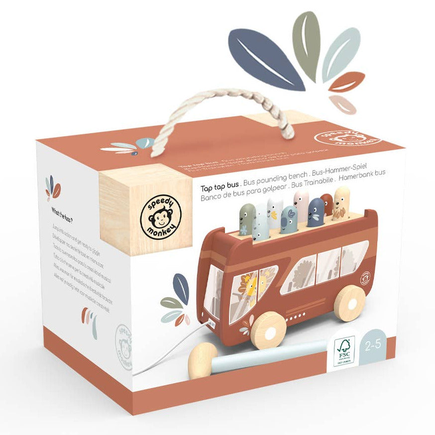 Enjoy this pull along bus that also offers a hammering activity. Includes 8 wooden characters and a sturdy hammer. Enjoy the fun while developing hand/eye co-ordination! This wooden toy is designed with gently curved edges and comes in our successful color palette. This toy is crafted from sustainably sourced wood from FSC® certified forests and coated with non toxic paint.