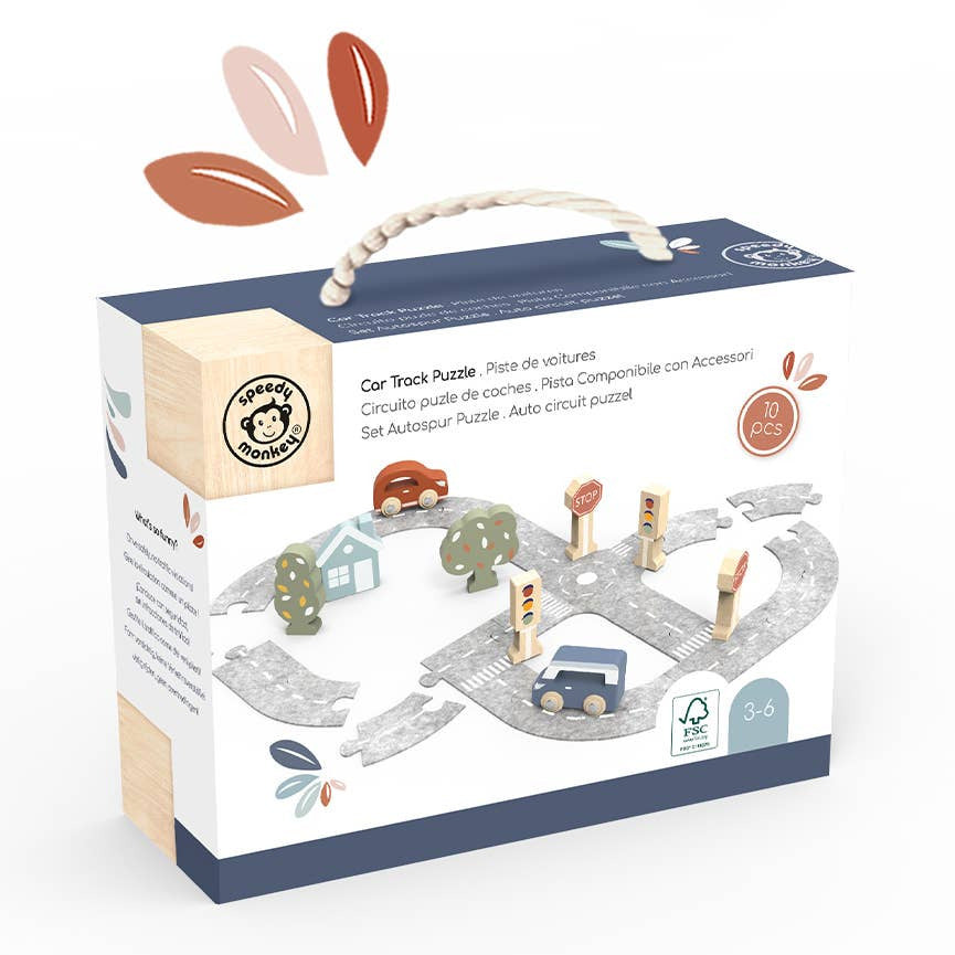 Our Car Track Puzzle is not only a source of entertainment, but also a great way to promote problem-solving skills and hand-eye coordination in children. The durable FSC certified wood ensures long-lasting use, making it a perfect addition to your little one's playtime collection. Puzzle track is made of gray felt. Recommended Age: 3 years and above.