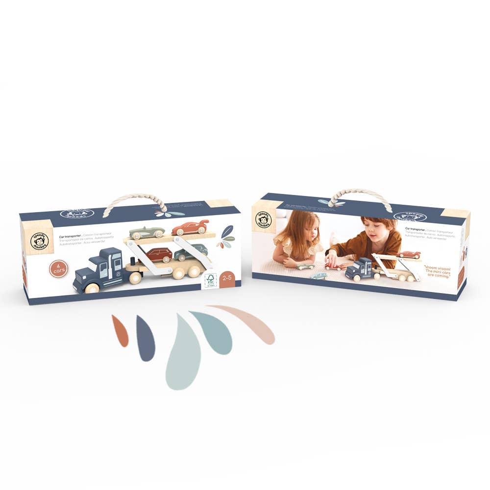 This wooden car transporter truck toy has a double-deck trailer that easily converts for loading and unloading. Four colorful assorted models of solid wooden cars are included with the trailer, slots are designed on the trailer to avoid cars from falling. Your little one can safely race along an imaginary road. While exciting and fun, this toy helps to develop fine motor skills, manual dexterity and creative play. This toy is crafted from sustainably sourced wood from FSC® certified forests. Recommended Age: 2+