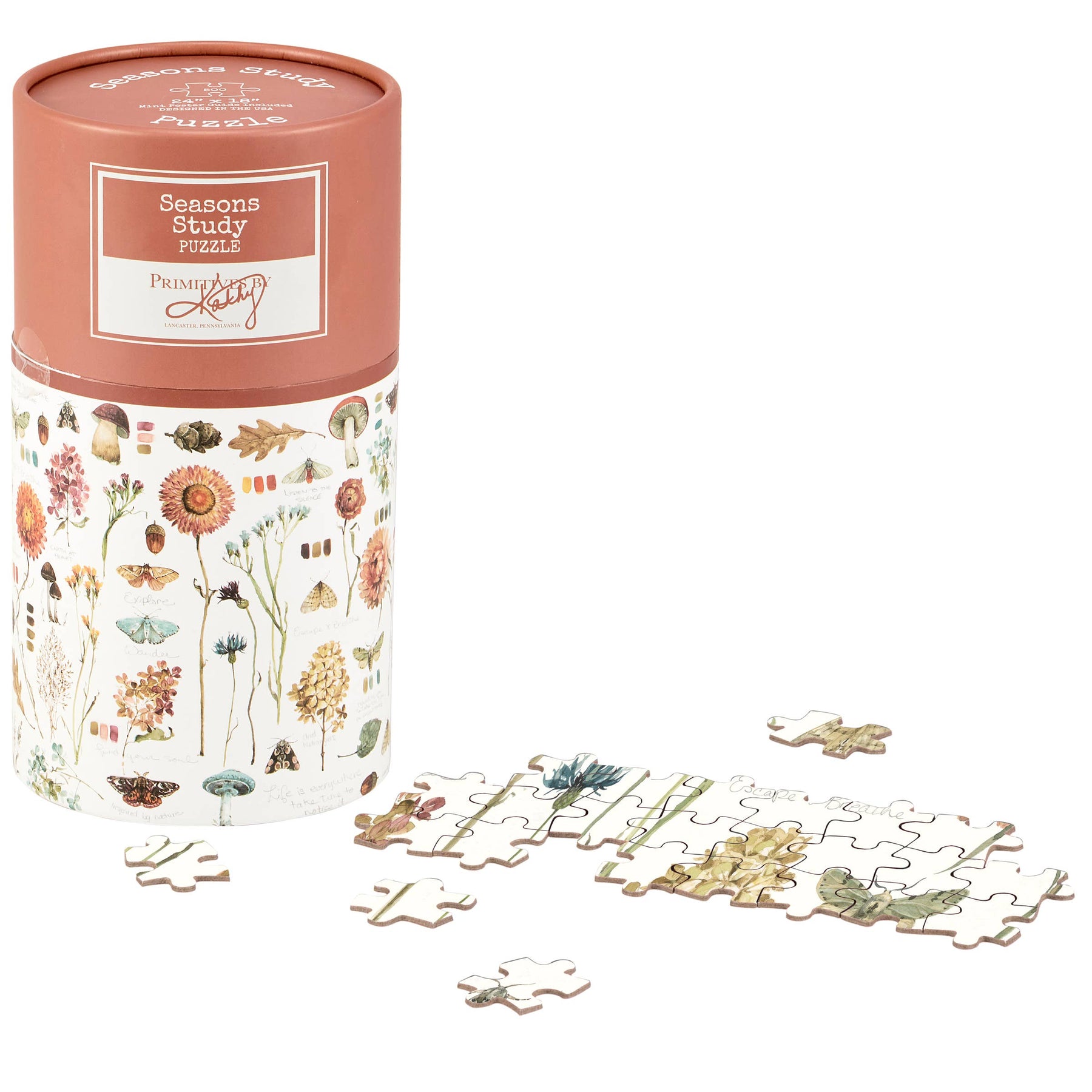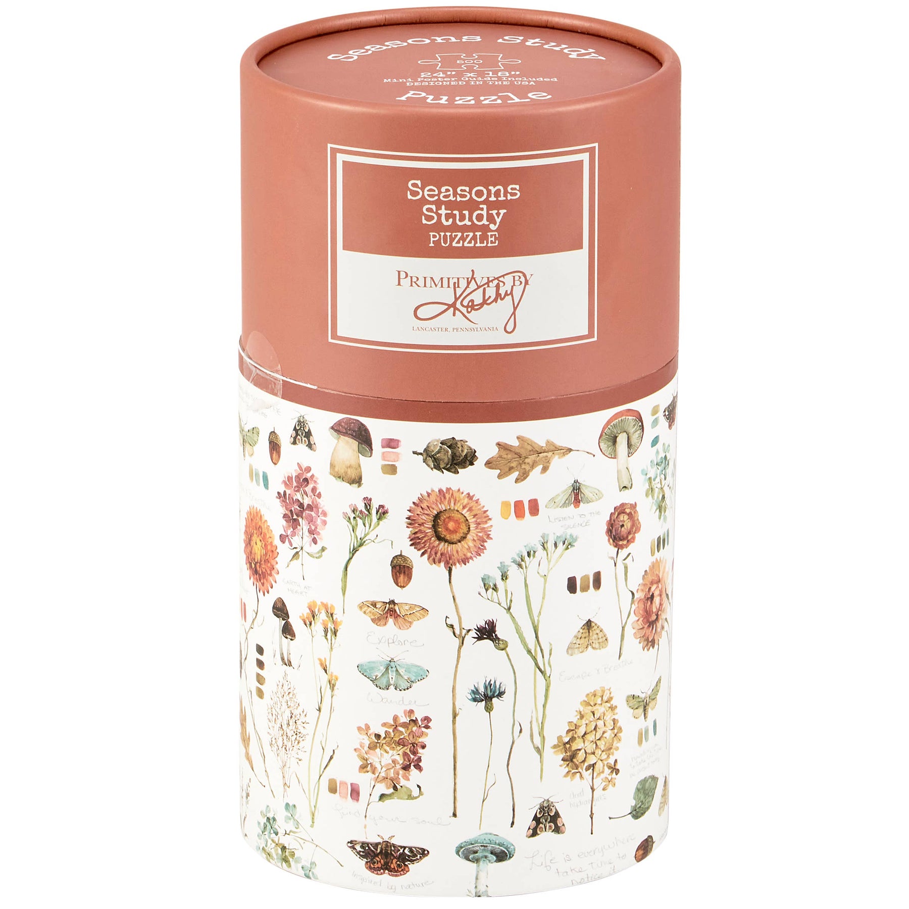 A 500 piece puzzle from the Fall & Harvest Collection displays a pattern of fall nature designs with accents of study notes. Design is replicated from original art hand painted in a delicate watercolor style. Puzzle pieces are packaged in a resealable plastic bag and enclosed in a cylindrical box with the design displayed around outside and a descriptive "Seasons Study Puzzle" sentiment on lid. Our Fall Study puzzle includes a printout of full puzzle image for reference. Contains small parts; this is not a toy. A fall-themed accessory great for seasonal gifting.