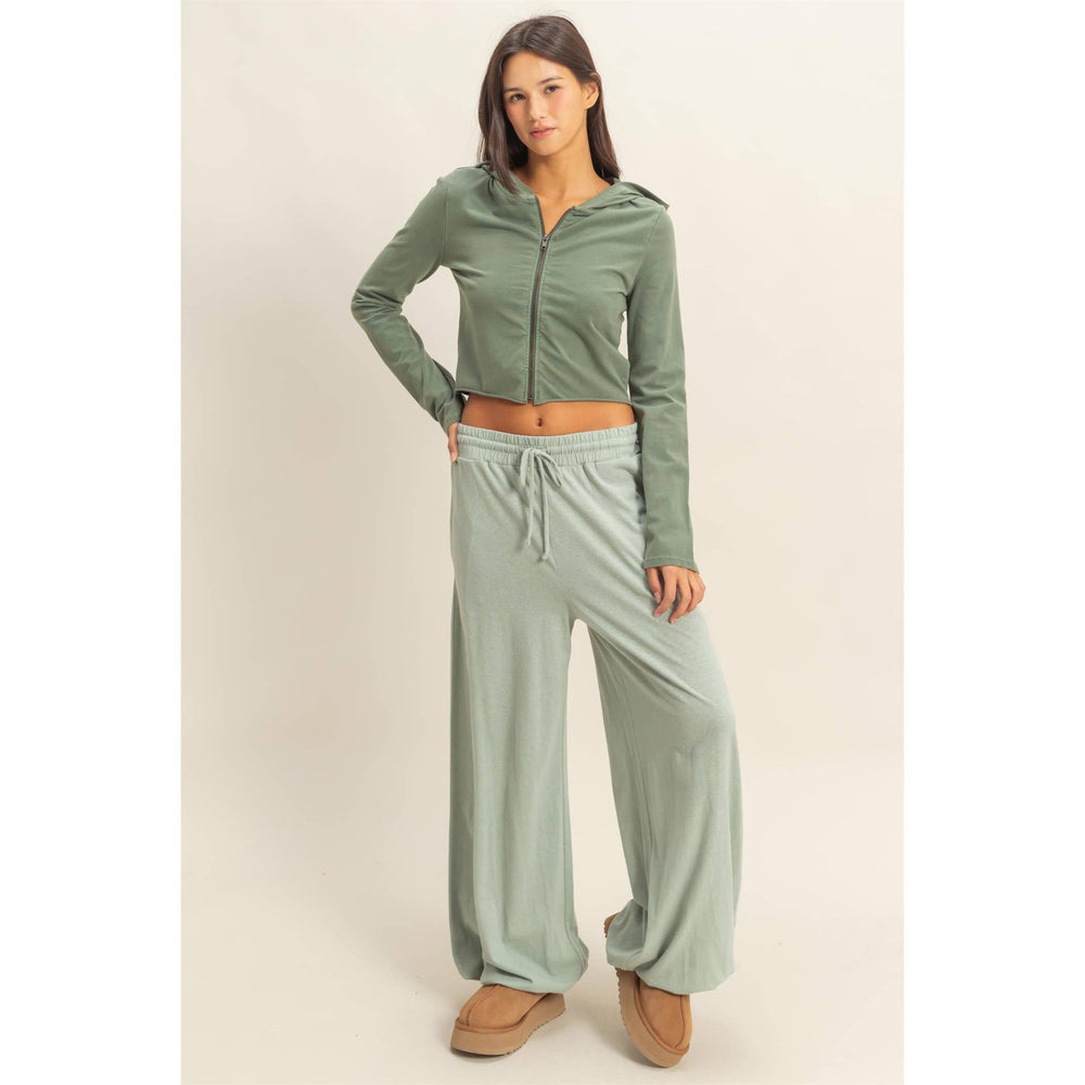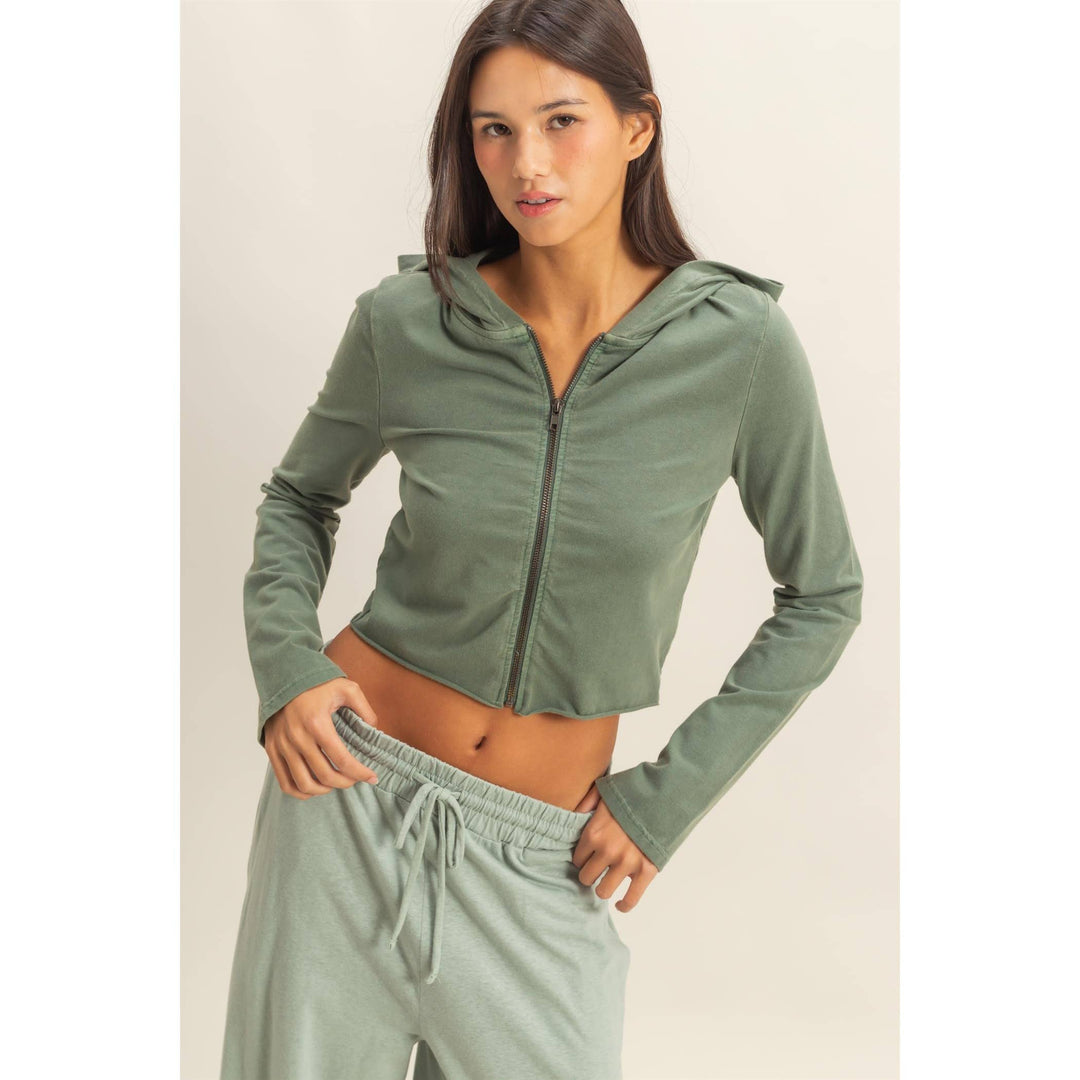 Olive Button/Zip Cropped Waffle Sweatshirt